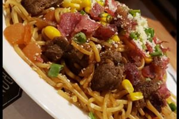 MACARRÃO COM MOLHO À BASE DE TOMATE, CEBOLA, BACON, CALABRESA, PARMESÃO RALADO, FILÉ DE FRANGO, FILÉ DE BOI, MILHO, SHOYO E TEMPERO VERDE.