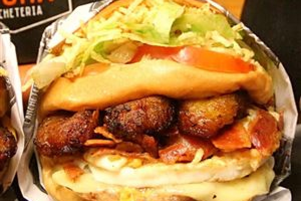 PÃO, CARNE DE HAMBÚRGUER TRADICIONAL, MUÇARELA, 2 OVOS, BACON, BANANA, TOMATE, ALFACE, MILHO E BATATA PALHA.